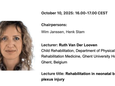 October 10, 2025: 16.00-17.00 CEST Chairpersons: Wim Janssen, Henk Stam Lecturer: Ruth Van Der Looven Child Rehabilitation, Department of Physical and Rehabilitation Medicine, Ghent University Hospital, Ghent, Belgium Lecture title: Rehabilitation in neonatal brachial plexus injury Registration: required Attendance: free